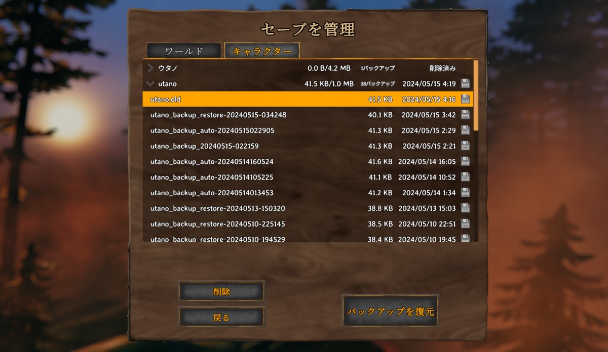 必要に応じて、過去のセーブデータを削除、または過去のセーブデータから復元を試行することができます。